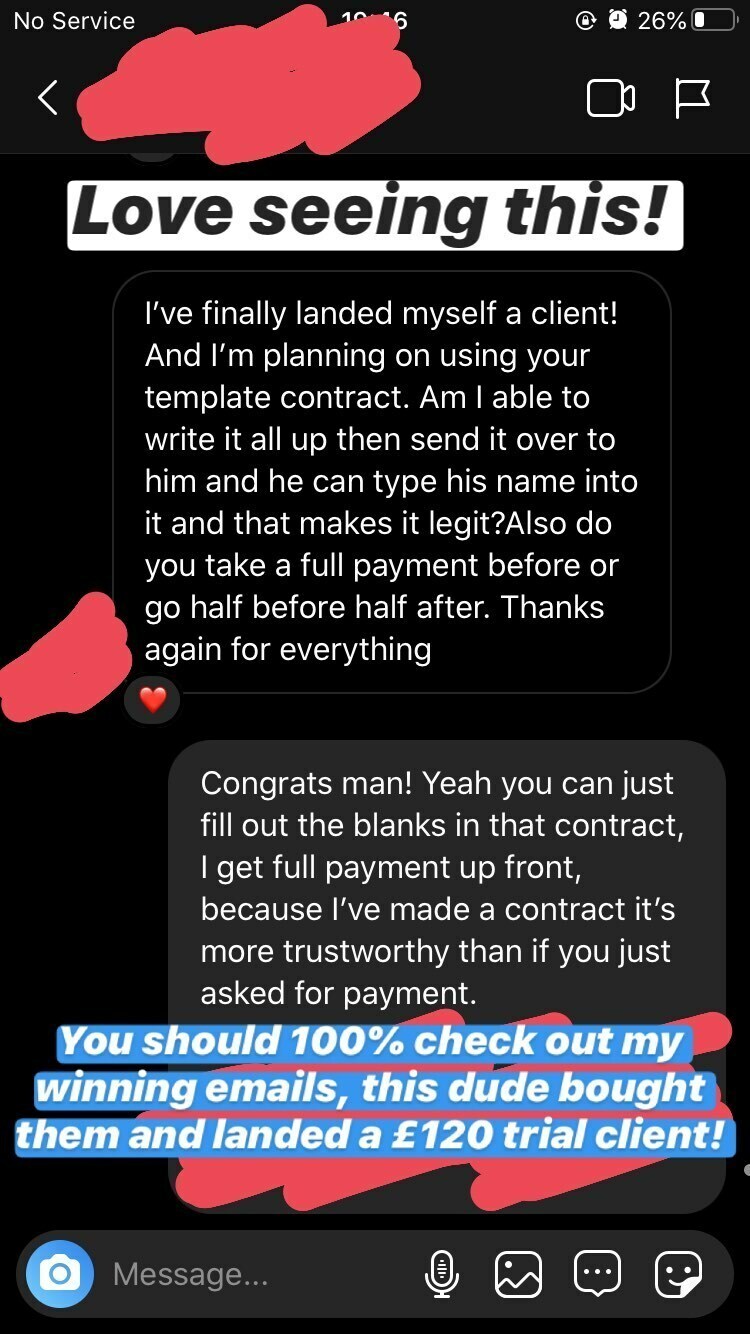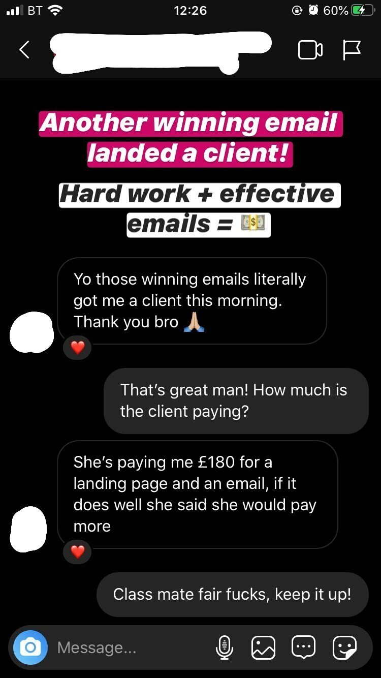 I looked up every aspect of the business model; how to learn it, how to get good at it, how to structure my emails, and how to close a client on a deal. And I won't lie, it took me a shit tonne of work. I spent hours every single day practicing, consuming, and sending cold emails.